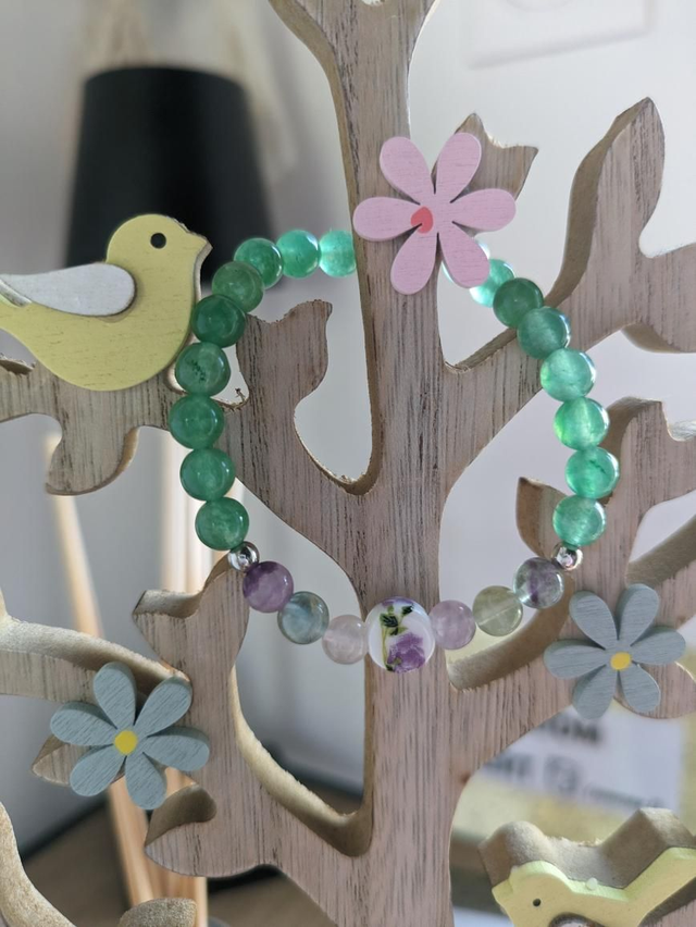 Couleurs printanières 💐 Bracelet élastique Aventurine verte 💚 et Fluorine 💚💜. Création artisanale (par mes petites menottes 🫡). Mise à taille possible. Pièce unique.