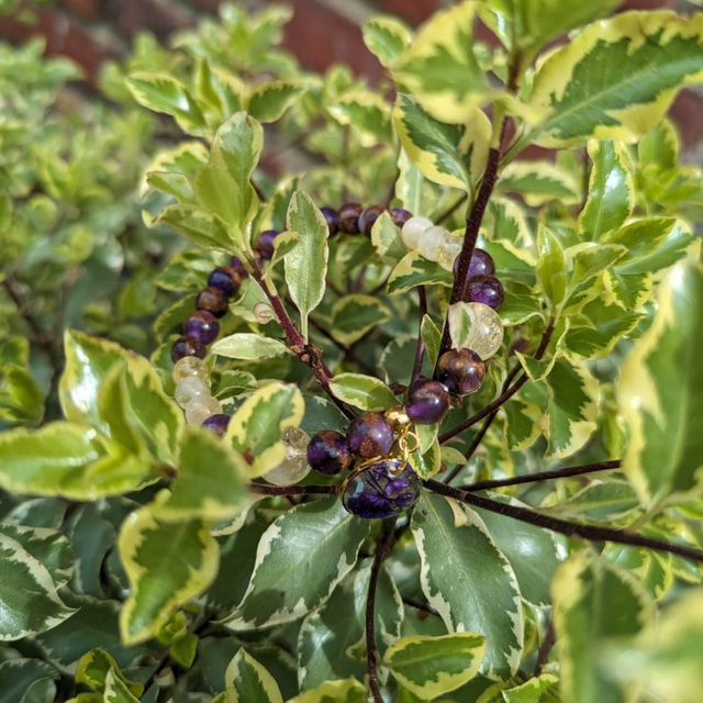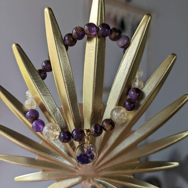 Bracelet Jaspe 💜 et Citrine 💛, breloque en fleurs séchées🪻. Création artisanale (par mes petites menottes 🫡). Personnalisation et mise à taille possibles. Pièce unique.