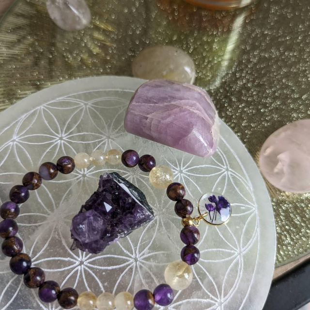Bracelet Jaspe 💜, Citrine 💛 et fleurs séchées 🌸