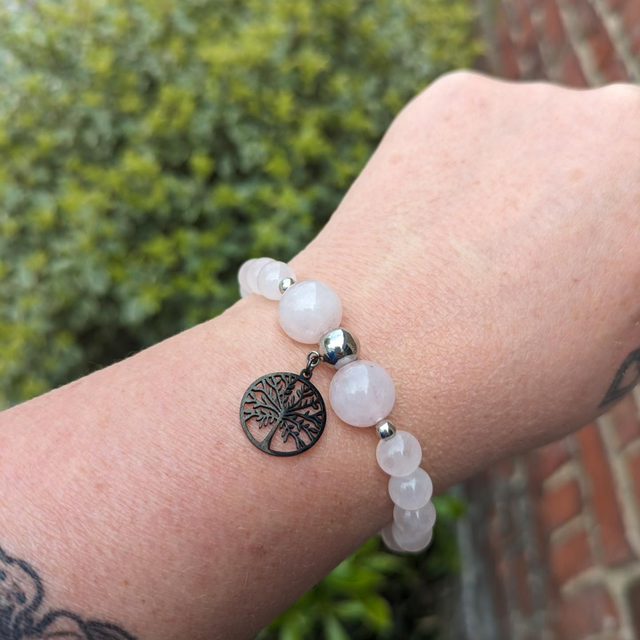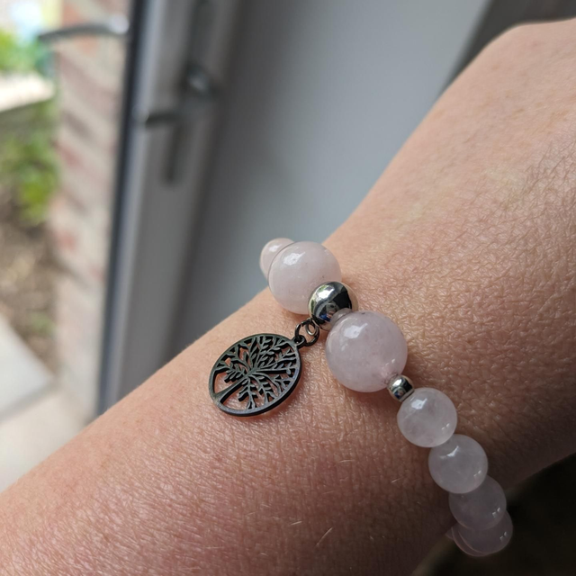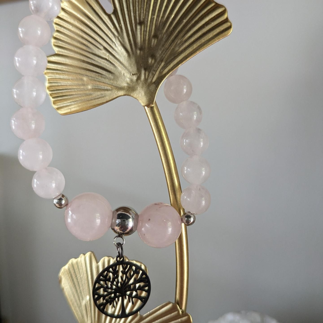 Full Quartz rose 🩷🩷🩷 Bracelet en perles de 8mm + 2 de 12mm. Arbre de vie noir 🖤