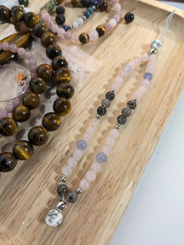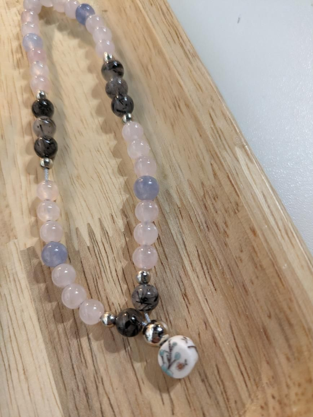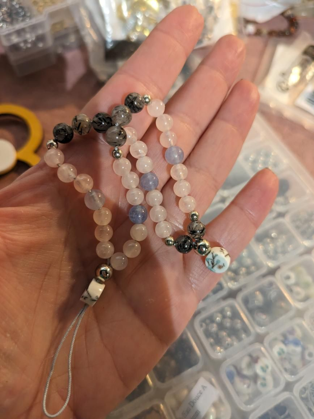 Dragonne 🐉de portable tout en douceur : quartz rose 🩷, aigue marine 🩵 et quartz tourmaline 🩶